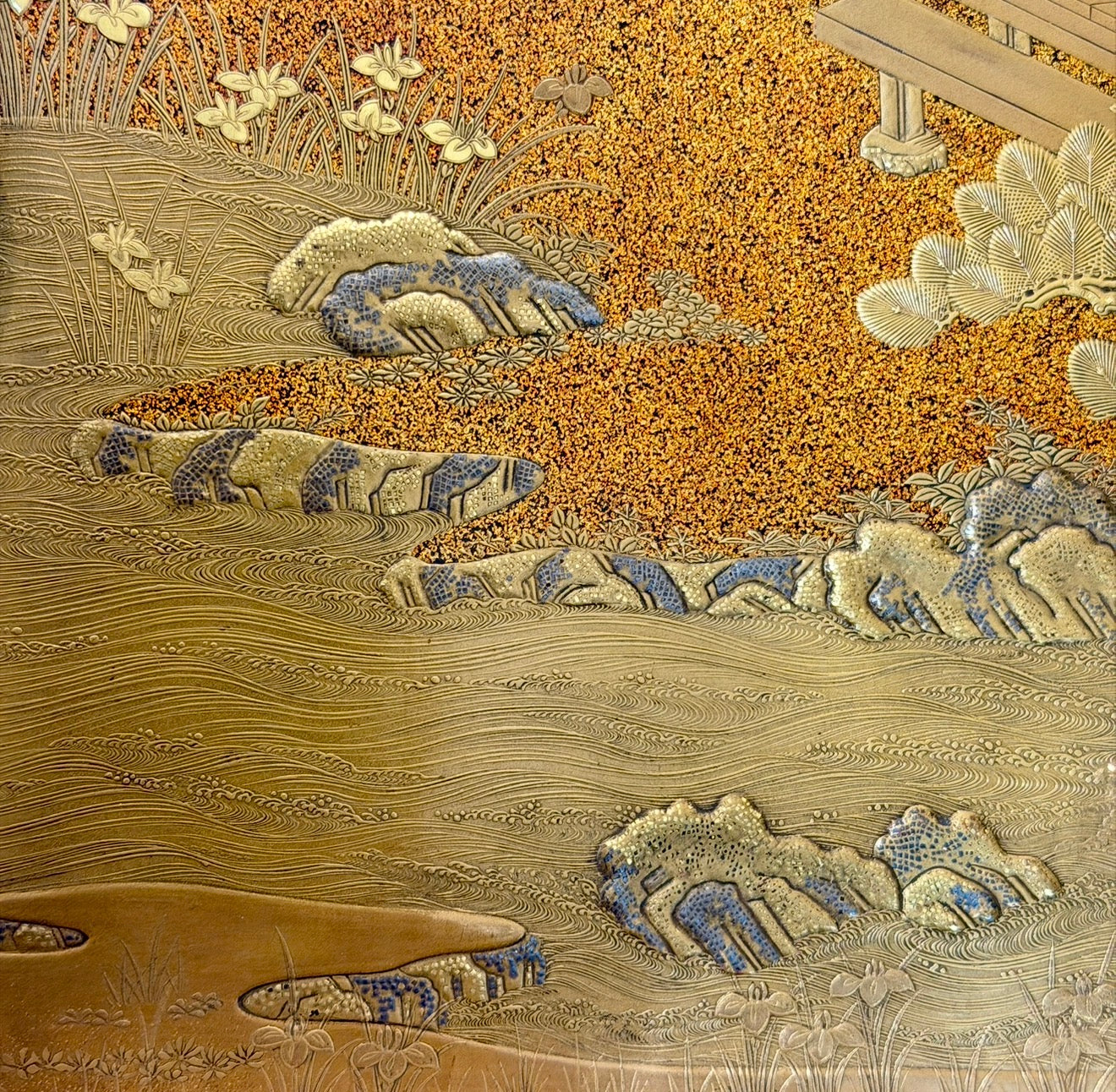 The sides continuing the nashiji ground, one panel carrying the bamboo fence motif around the edge in disciplined hira-maki-e, with subtle extension of grasses across the corner transitions.
