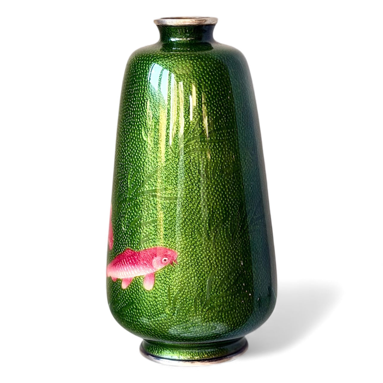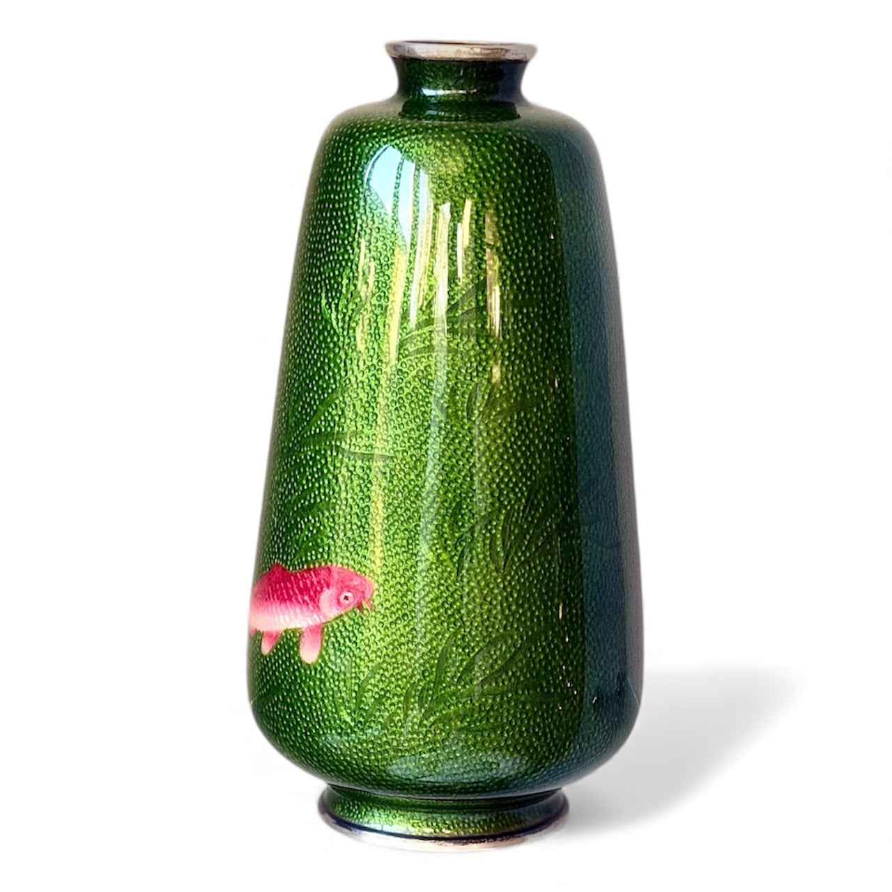 A Japanese Cloisonné Enamel Vase with Koi over Emerald Nanako Ground Nagoya, late Meiji period