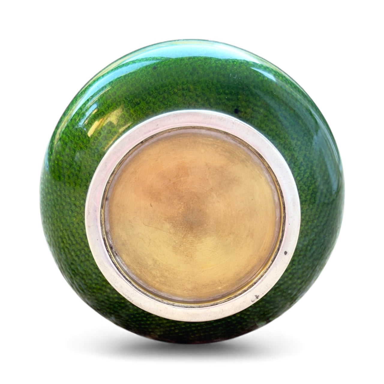 The neck is mounted with a silver rim formed with a distinctive double-collar construction incorporating an inner brass throat, a practical and characteristic feature of high-grade Nagoya production which allowed the enamel decoration to extend cleanly to the lip while maintaining stability during repeated firings. The interior and recessed base are enamelled in deep green.
